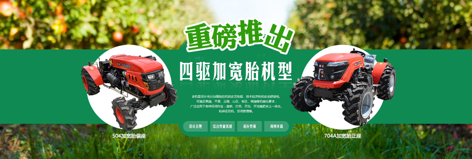 我公司主要经营产品有:果园管理机、拖拉机(窄距拖拉机、小型拖拉机、轮式拖拉机、山地拖拉机、四驱拖拉机)、果园施肥机(开沟施肥合土一体机、偏置开沟施肥复土一体机)、打药机(风送喷雾打药机、小型风送喷雾打药机、大型风送喷雾打药机、果园打药机)、开沟机(中开沟机、偏置开沟机、果园开沟机)、粉碎还田机、果园打草机、碎枝机(大型碎枝机、开荒机、山地开荒机)、旋耕机(1米旋耕机、1.2米旋耕机、1.3米旋耕机、1.4米旋耕机、1.5米旋耕机以及偏置旋耕机)、双铧犁等。不断研制出适应国内现代化果园需求的果园装备系列产品,并取得国家多项专利。